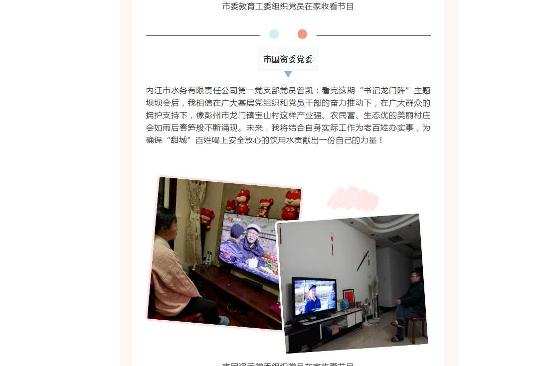 六個黨支部高度重視、立即行動,在周六晚上7:50準時組織黨員收看節(jié)目,并在內(nèi)江水務(wù)黨務(wù)微信群里把收看照片和觀后感進行分享,大家積極踴躍,學(xué)習(xí)氣氛熱烈。